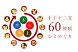 干支は本来、甲・乙・丙・丁・戊・己・庚・辛・壬・癸の十干(じっかん)と、子・丑・寅・卯・辰・巳・午・未・申・酉・戌・亥からなる十二支(じゅうにし)を組み合わせたものをいい、60通りの組み合わせがあります。
