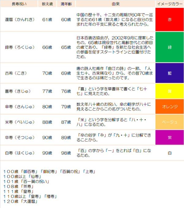 日本では長寿を祝う習慣は室町時代より始まり、節目節目には長寿を共に喜び、更なる長生きを願って各家庭でお祝いをしました。長寿の祝いとして還暦を祝う事が一般的になったのは江戸時代といわれています。